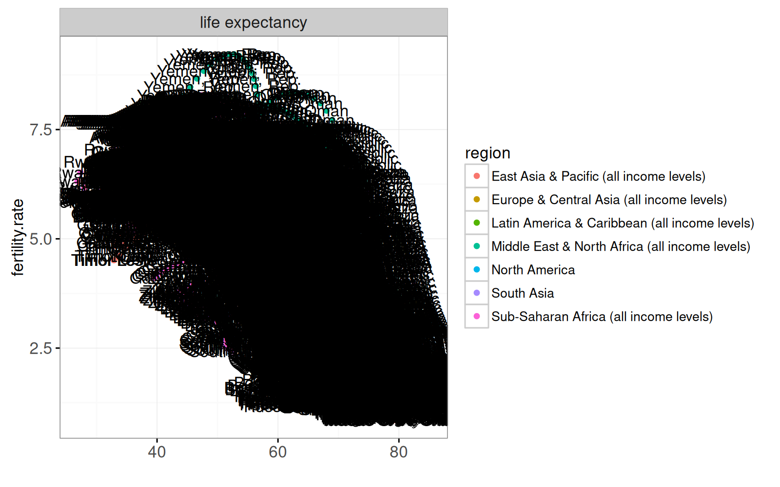 data=WorldBank))The data visualization above shows the currently selected country name in the selection menu, but it would be better to show it as a text label on the scatterplot. We can do that by adding a geom_text layer with two showSelected variables:
