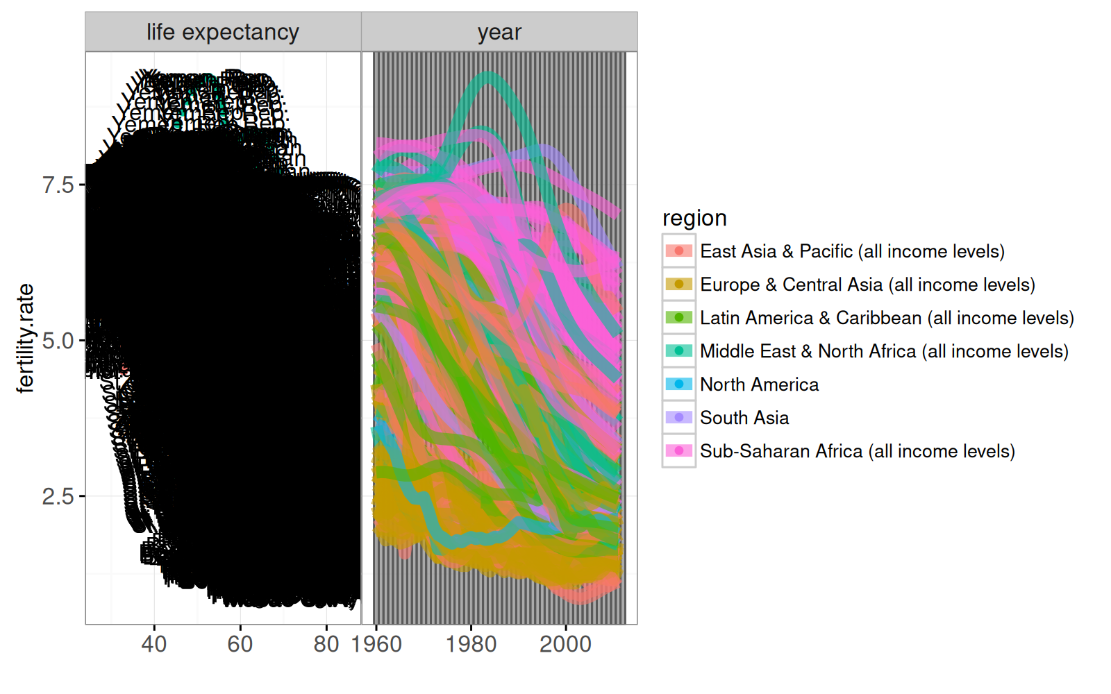Note that the ggplot above uses the same aes definitions as the scatterplot from the previous section. The only difference is that we have used an augmented WorldBank data set with an additional x.var variable that we use with facet_grid. Below, we add geoms for a time series plot that is aligned on the fertility rate axis.
