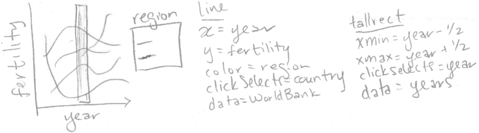 Note that the sketch above includes geom_tallrect, a new geom introduced in animint. It is “tall” because it occupies the entire vertical space of the plot, and thus only requires definition of its horizontal limits via the xmin and xmax aesthetics. Specifying clickSelects=year means that we want to be able to draw one tallrect for each year, and click a tallrect to change the selected year. Thus we need to create a new data set called years with one row for each unique year of the WorldBank data.