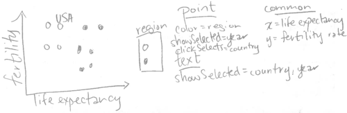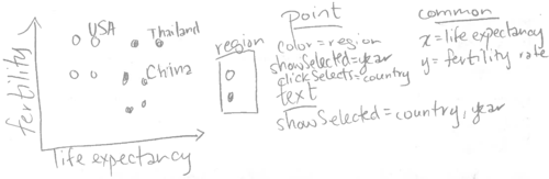 selector.types option to specify multiple selection variables.In this section, we will explain how the clickSelects keyword is implicitly used in interactive legends. If you have read the previous chapters, you have already implicitly used clickSelects, which was automatically created for the interactive legends in the previous chapters. For example, consider the sketch of the World Bank data viz from the last chapter.