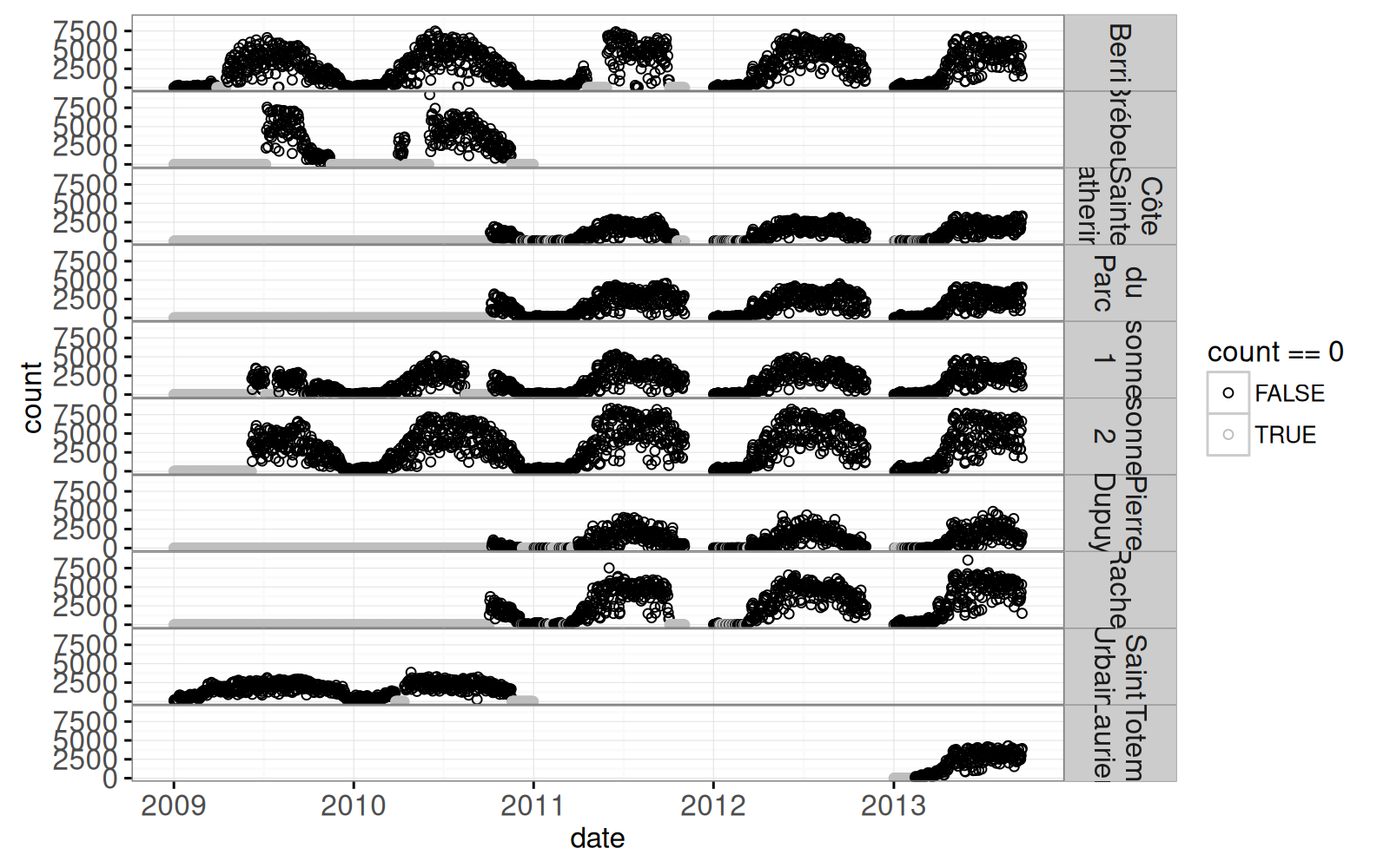 (counts.dt <- data.table(montreal.bikes$counter.counts)) location date count
