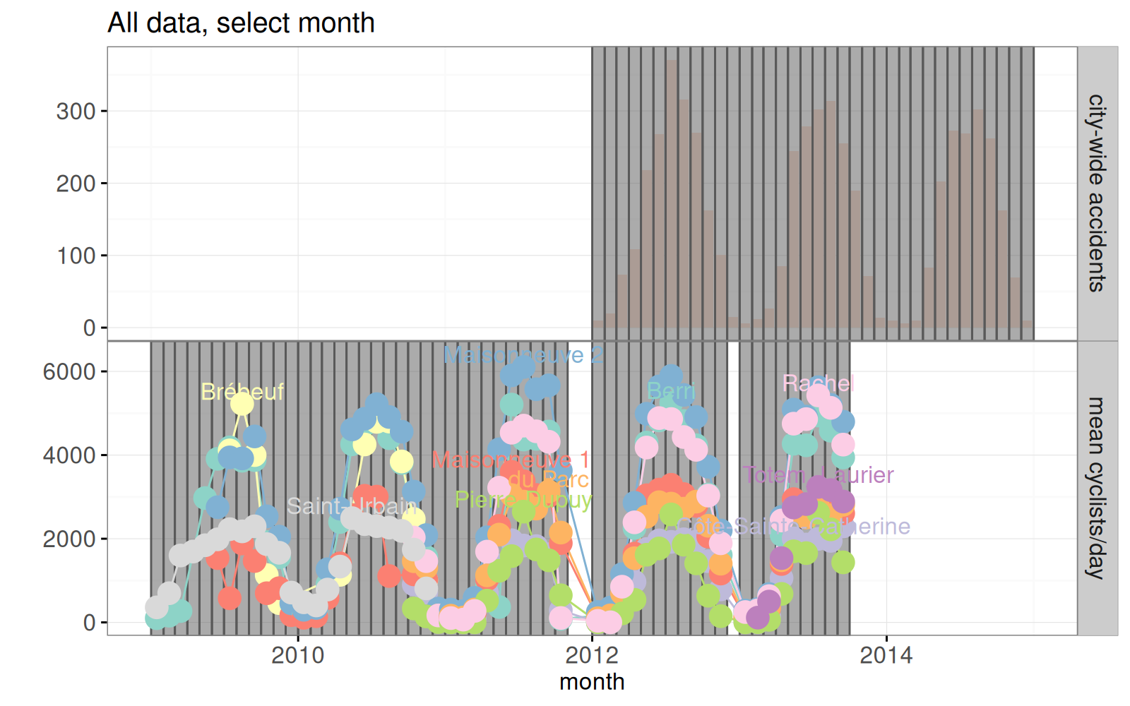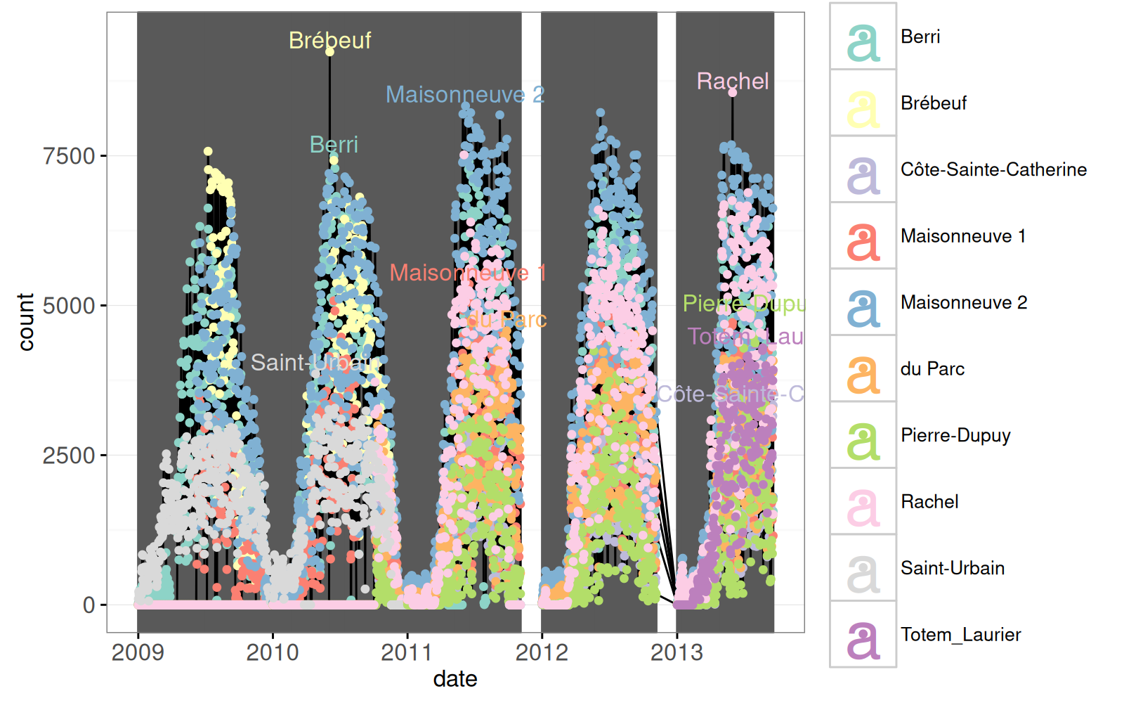 We begin by loading the montreal.bikes data set, which is not available in the CRAN release of animint2, in order to save space on CRAN. Therefore to access this data set, you will need to install animint2 from GitHub: