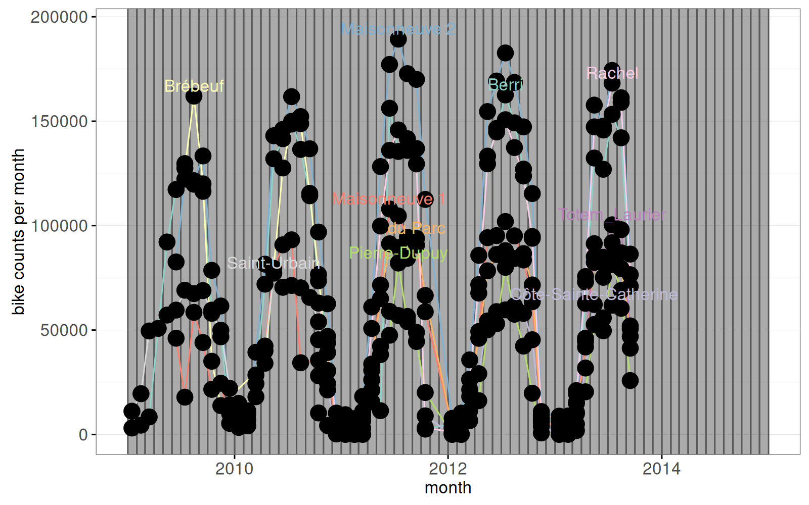 In this chapter we will explore several data visualizations of the Montreal bike data set.
