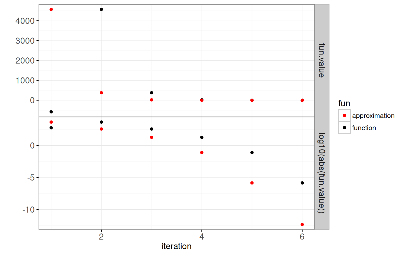 solution, y="log10(abs(fun.value))", fun="function"))+