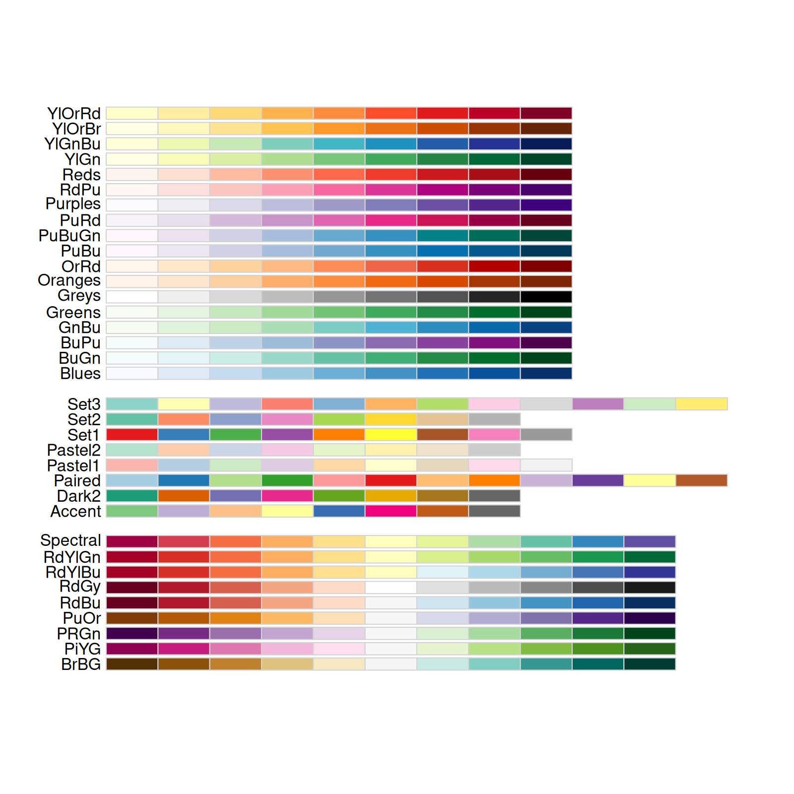 Color and fill legends in ggplot2 can be manually specified via scale_color_manual and scale_fill_manual. Typically we will choose one of the ColorBrewer palettes: